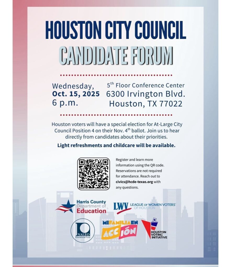 Houston voters will have a special election for At-Large City Council Position 4 on their Nov. 4th ballot. Join us to hear directly from candidates about their priorities. Light refreshments and childcare will be available.
